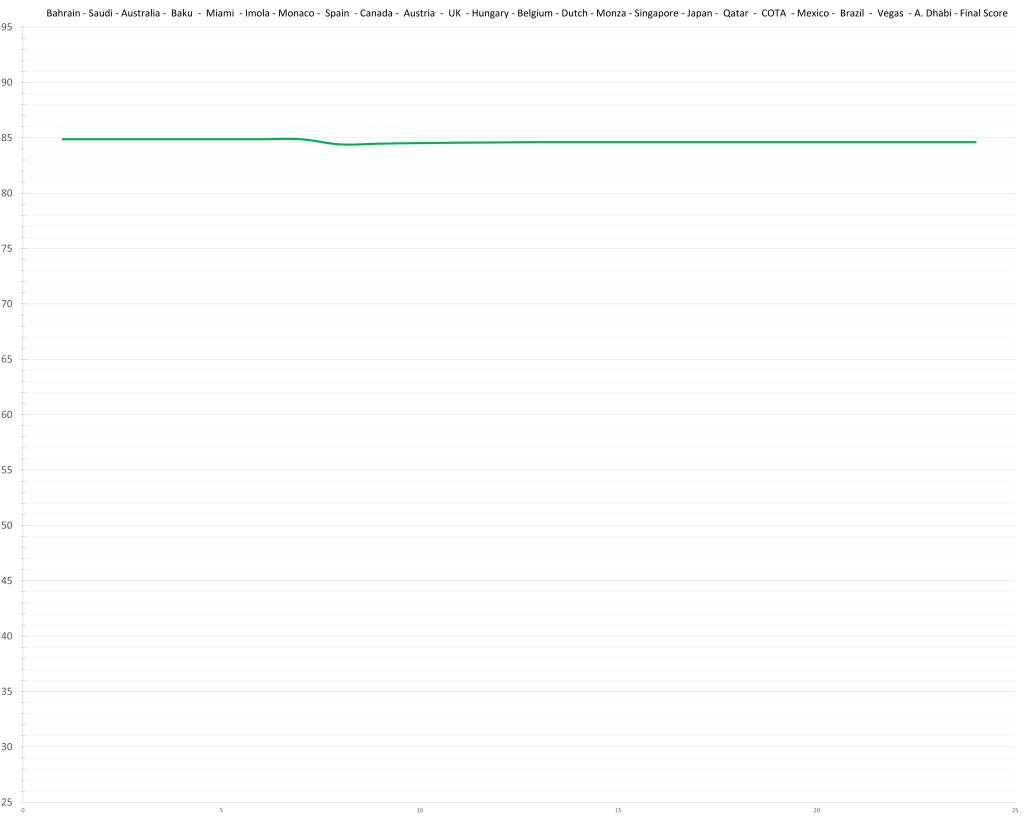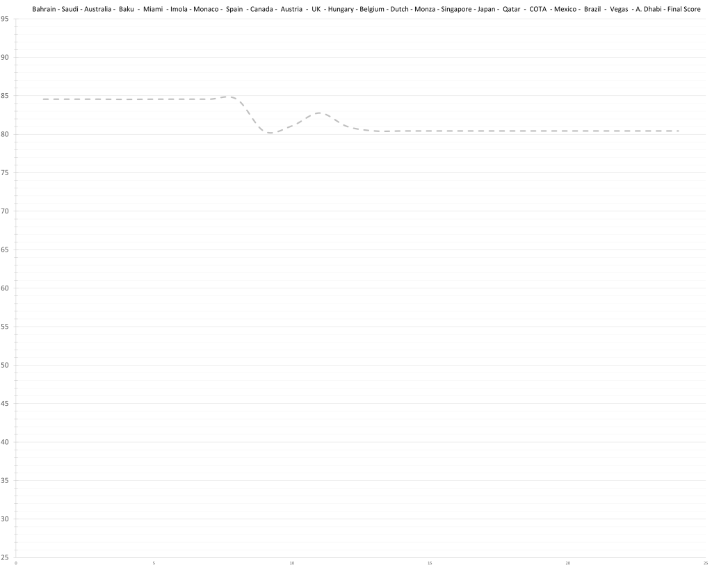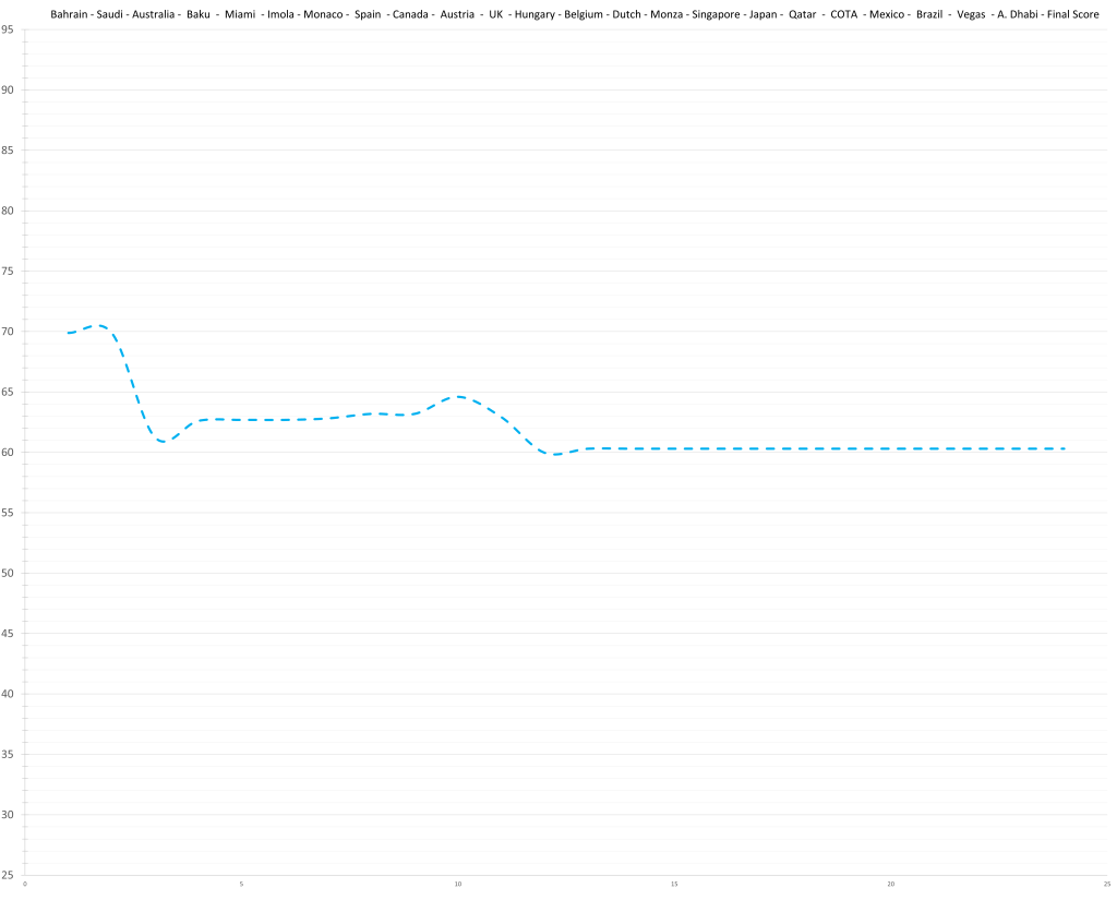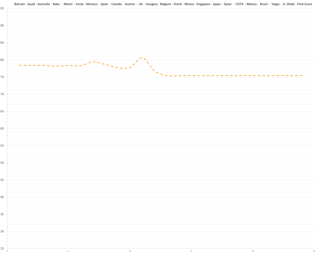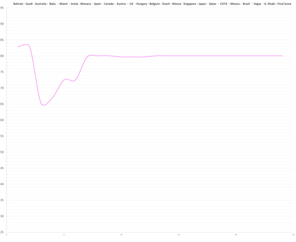 Unsurprisingly, Checo is having a horrible season. The Mexican is not rated very highly by the model anyway, naming him one of the slower drivers on the grid. Even a flawless Checo tops out as an average driver at around 72 (like at the beginning of the season). However, he was anything but flawless, having made mistake after mistake between Monaco and Silverstone. With a car that shouldn’t place lower than 2nd, this results in a lot of lost points which is ultimately what the model is based on.