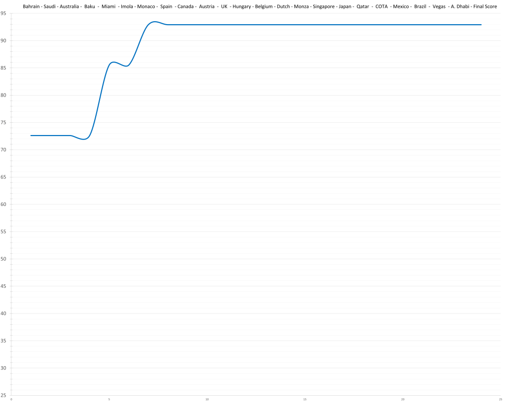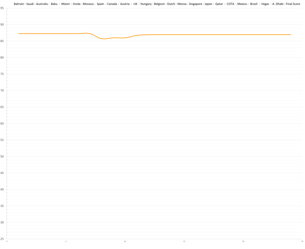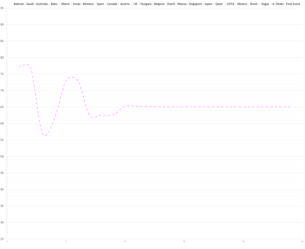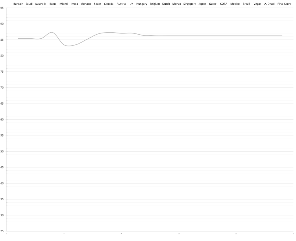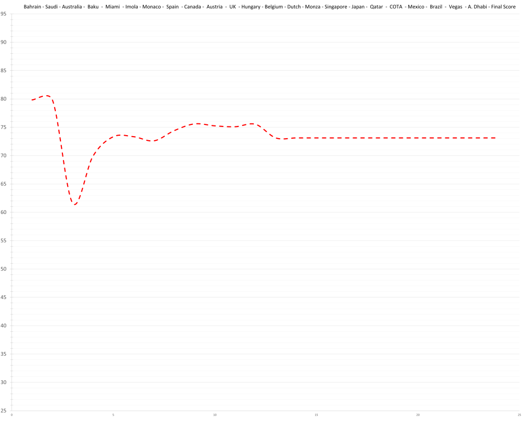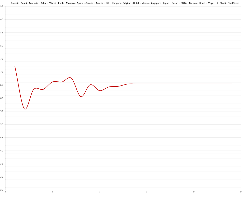 Unsurprisingly, Checo is having a horrible season. The Mexican is not rated very highly by the model anyway, naming him one of the slower drivers on the grid. Even a flawless Checo tops out as an average driver at around 72 (like at the beginning of the season). However, he was anything but flawless, having made mistake after mistake between Monaco and Silverstone. With a car that shouldn’t place lower than 2nd, this results in a lot of lost points which is ultimately what the model is based on.