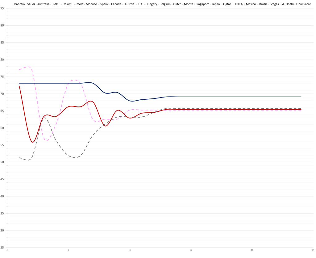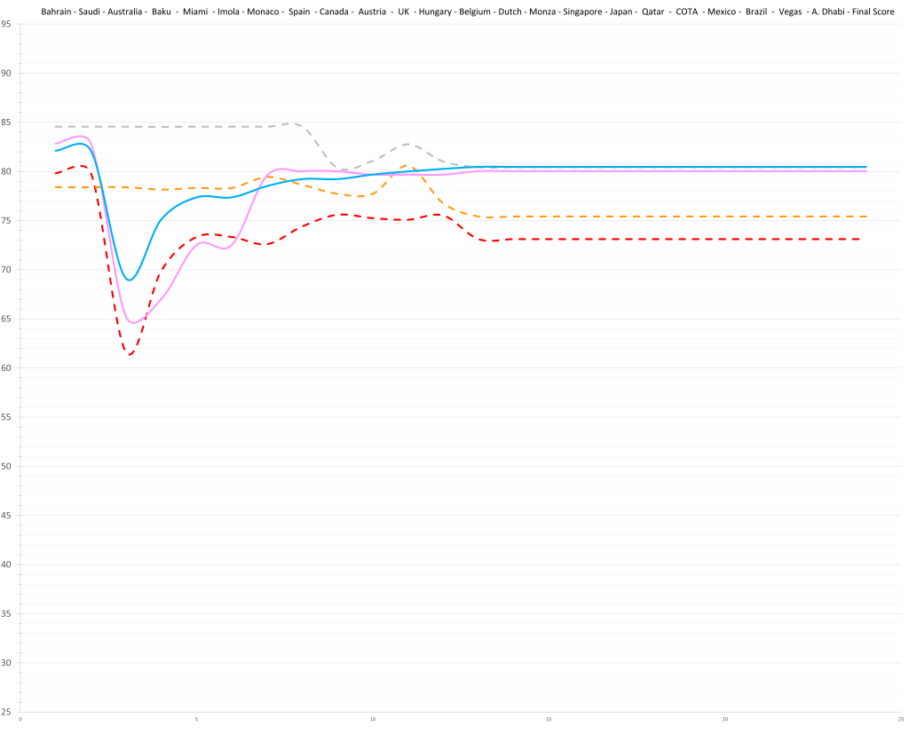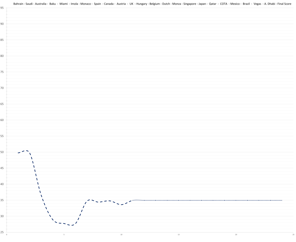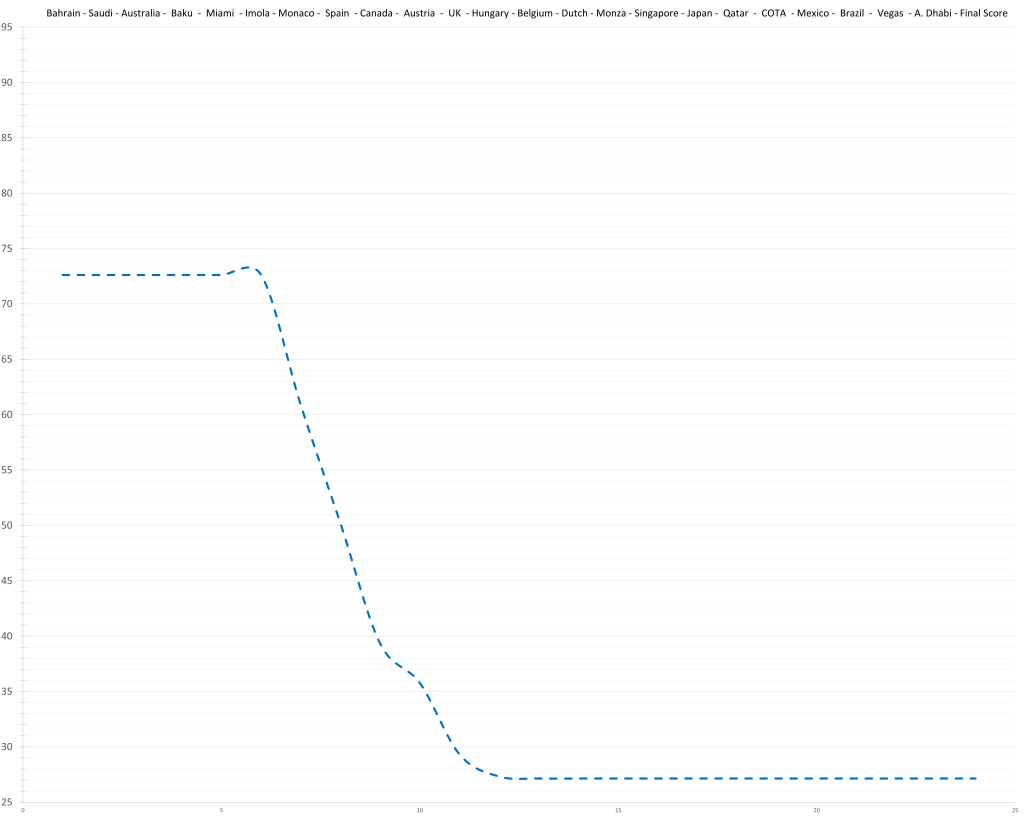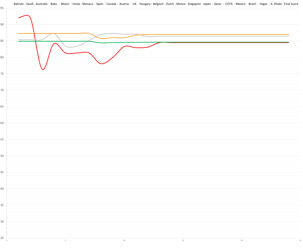 Unsurprisingly, Checo is having a horrible season. The Mexican is not rated very highly by the model anyway, naming him one of the slower drivers on the grid. Even a flawless Checo tops out as an average driver at around 72 (like at the beginning of the season). However, he was anything but flawless, having made mistake after mistake between Monaco and Silverstone. With a car that shouldn’t place lower than 2nd, this results in a lot of lost points which is ultimately what the model is based on.