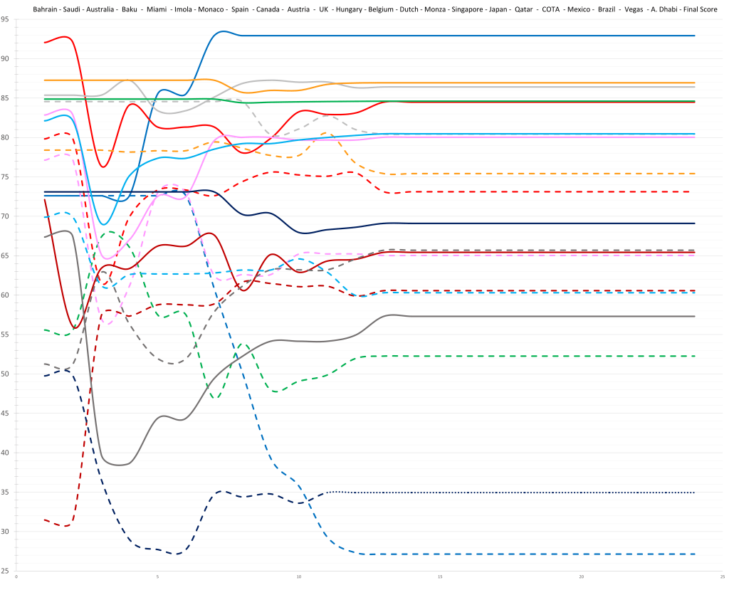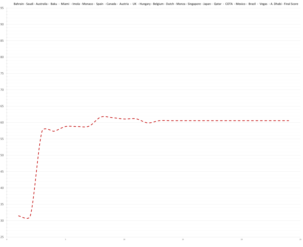 Pierre Gasly’s inclusion this far down the list is unfortunate. The frenchman could be around 80 but on top of not being mistake free, he was also extremely unlucky with ruined quali laps and being taken out in good positions. To add insult to injury, Ocon managed a P3 in Monaco which inevitably looks bad for Gasly, as he couldn’t reproduce anything close, except for the Belgian Sprint. However, sprints are not included in the model. As I said: Unfortunate. I definetly expect him to be much higher up come end of the season.