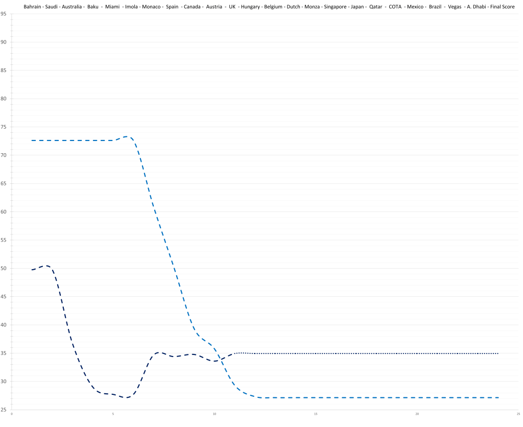 Nothing out of the ordinary as you can see. McLaren will obviously not stay put with their recent form and might make their way towards the top 4. Another observation: Red Bull is further ahead of 2nd placed Aston Martin than Aston is ahead of last placed Williams, showing both RB’s domination and how close the rest of the grid is to each other.