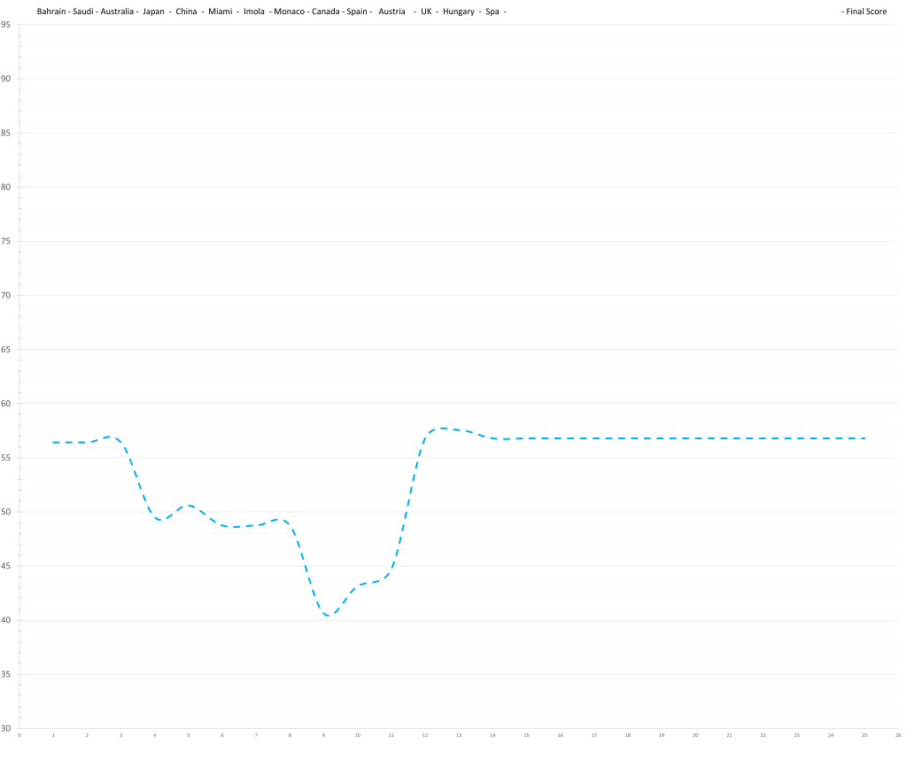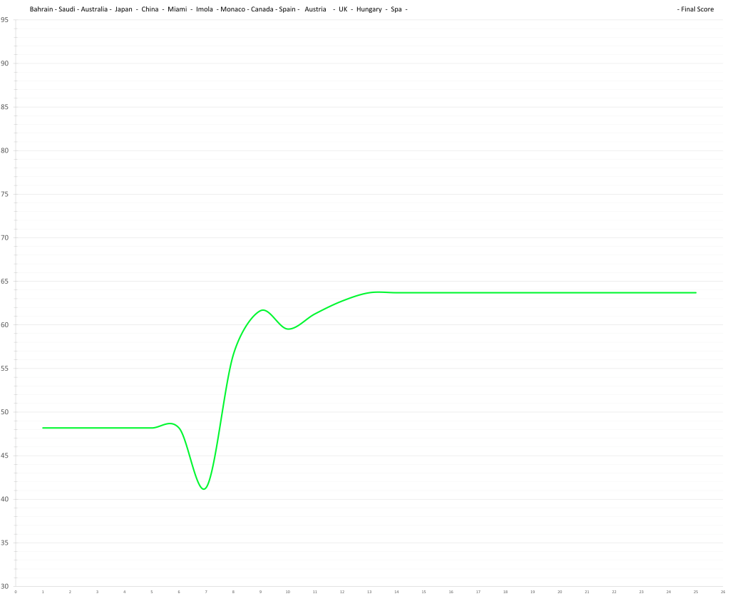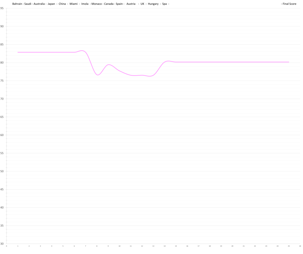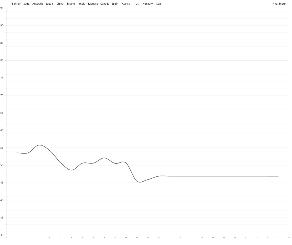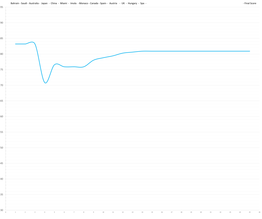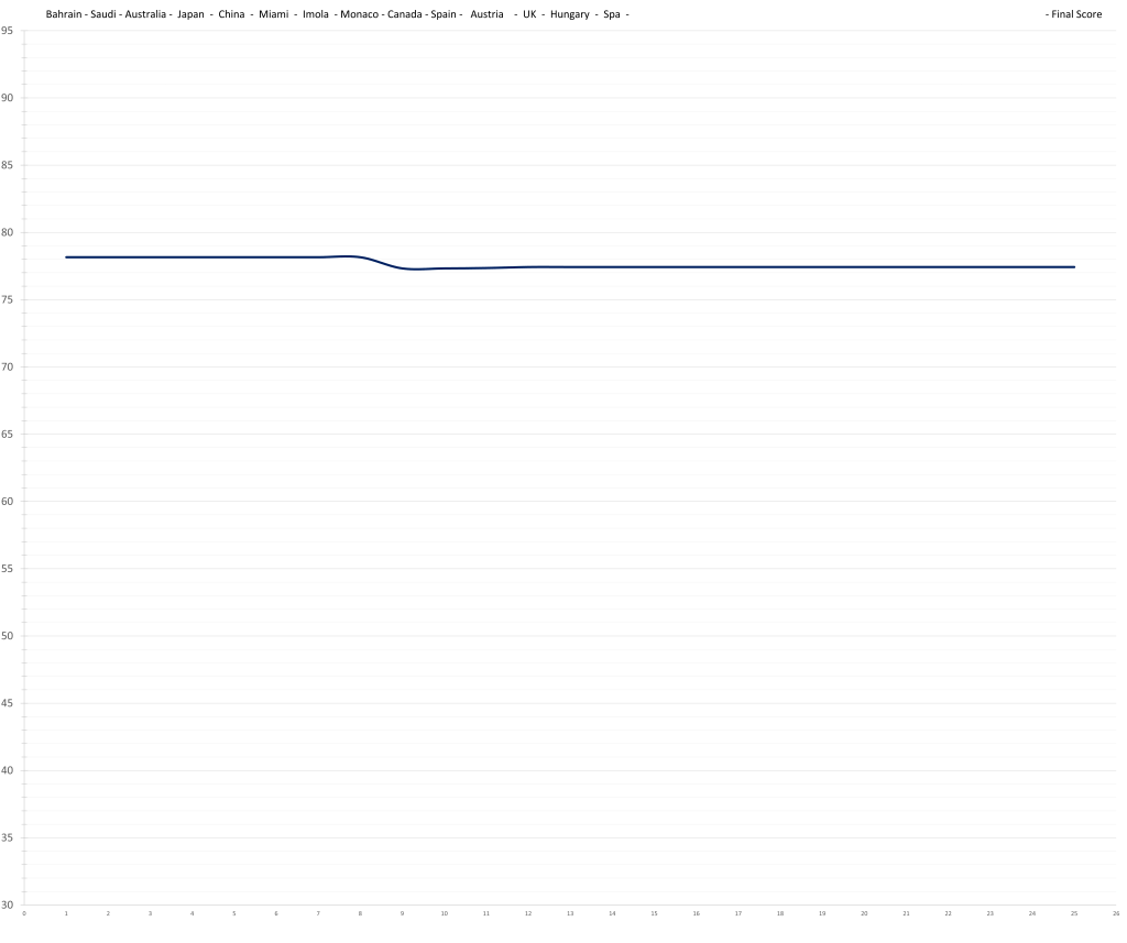 Logan Sargeant has had barely any clean races so far. Luckily (for his score), Silverstone was one of the few. With Williams being uncharacteristicly competitive (although it’s not a complete anomaly), his P11 pulls quite a lot of weight. This is also clearly visible in the graph, where it shows up as a big jump for Logan, essentially lifting him out of “Should-Be-Gone” territory.