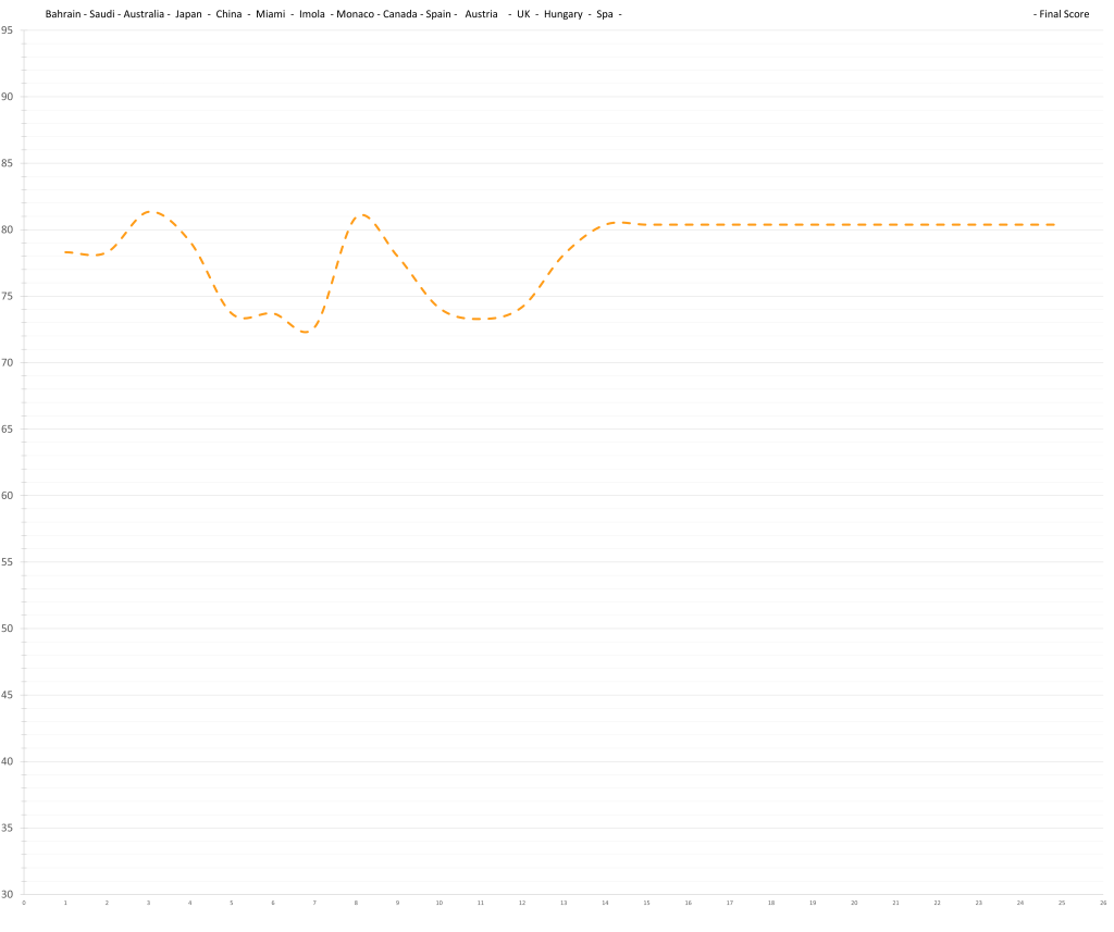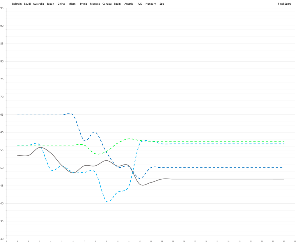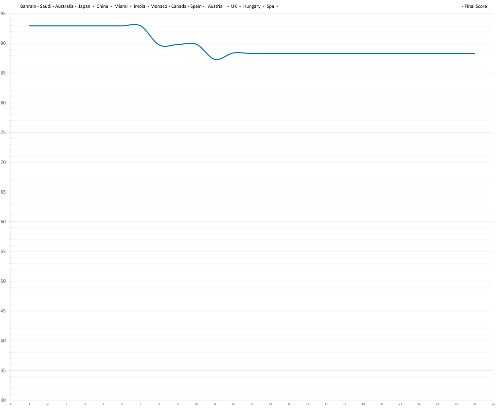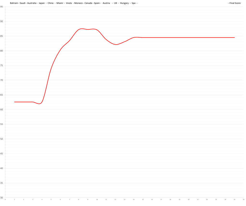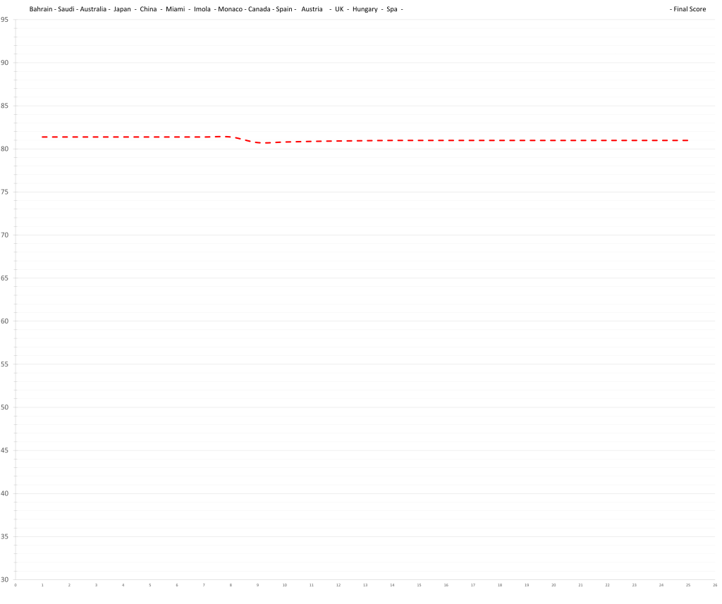 Logan Sargeant has had barely any clean races so far. Luckily (for his score), Silverstone was one of the few. With Williams being uncharacteristicly competitive (although it’s not a complete anomaly), his P11 pulls quite a lot of weight. This is also clearly visible in the graph, where it shows up as a big jump for Logan, essentially lifting him out of “Should-Be-Gone” territory.