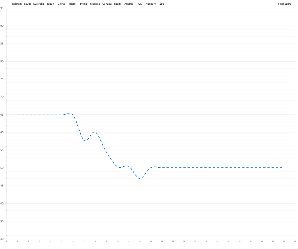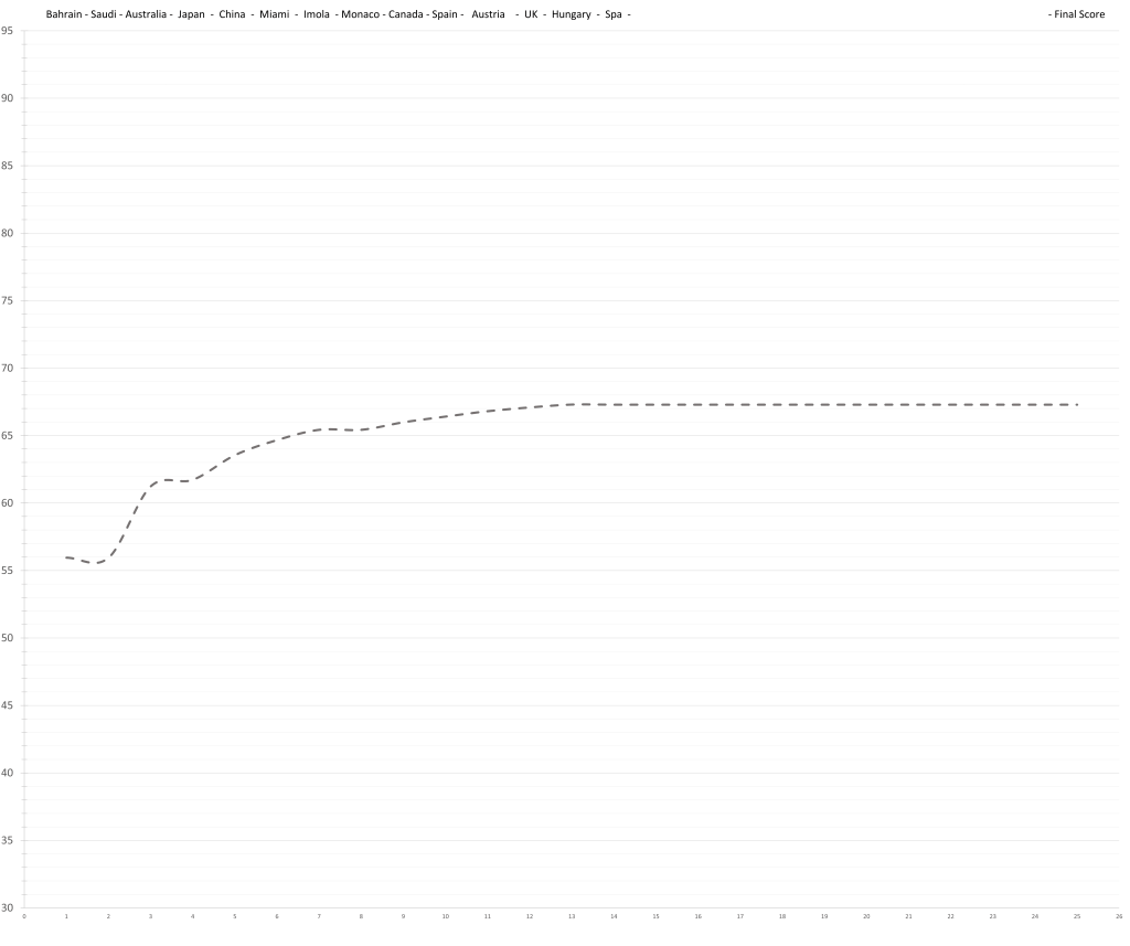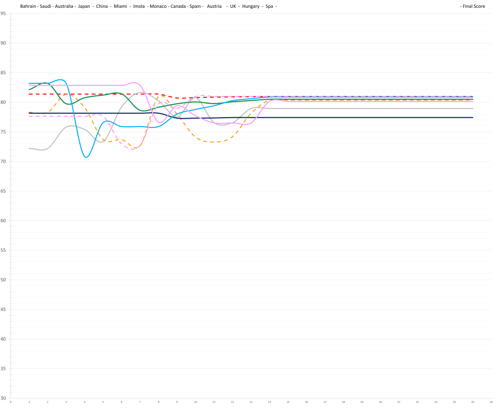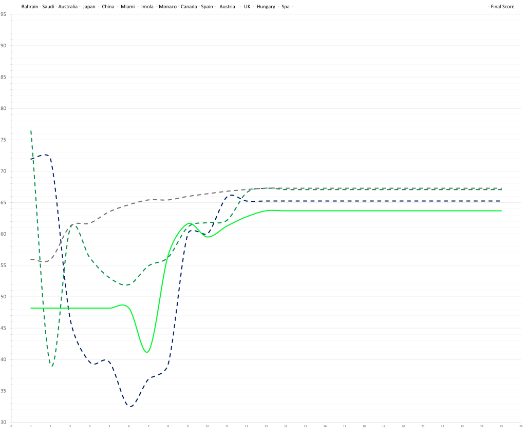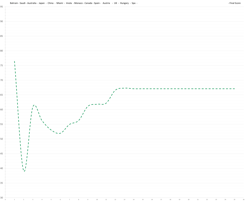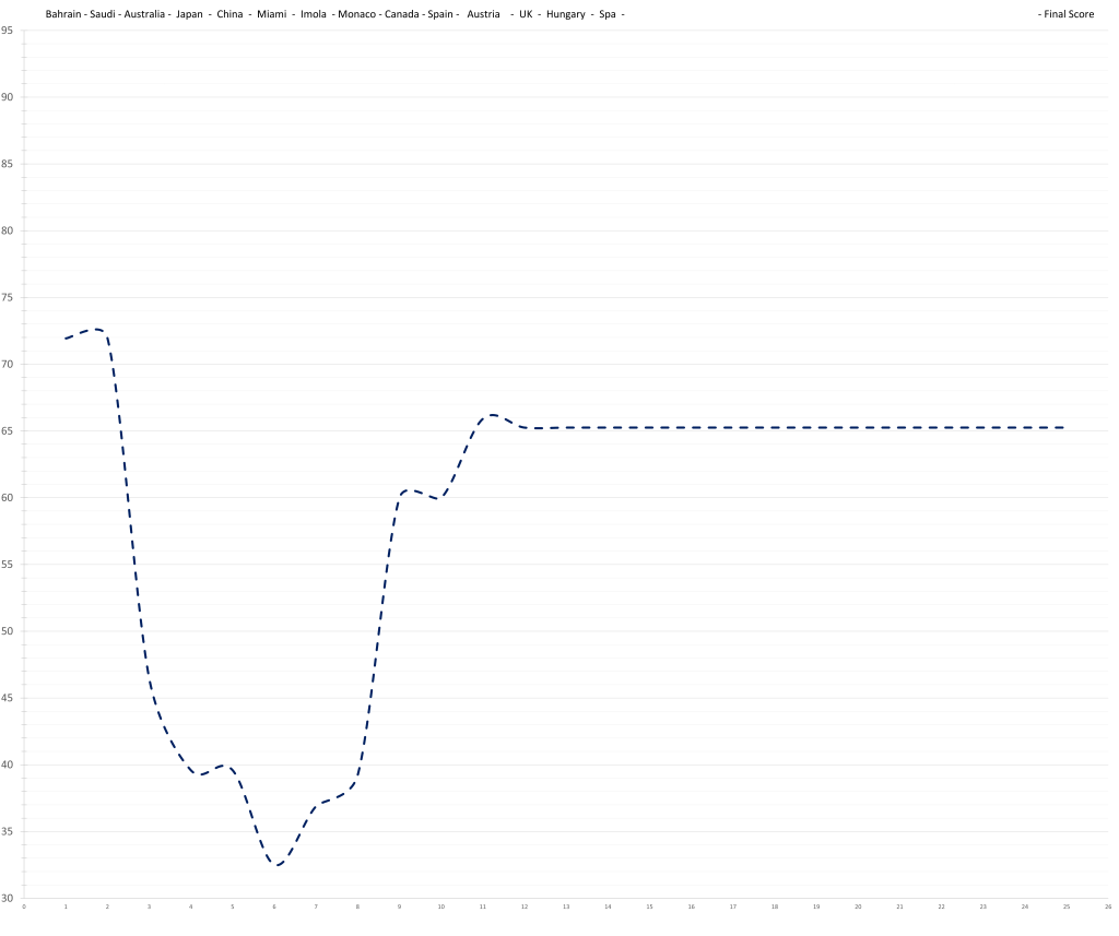 Logan Sargeant has had barely any clean races so far. Luckily (for his score), Silverstone was one of the few. With Williams being uncharacteristicly competitive (although it’s not a complete anomaly), his P11 pulls quite a lot of weight. This is also clearly visible in the graph, where it shows up as a big jump for Logan, essentially lifting him out of “Should-Be-Gone” territory.
