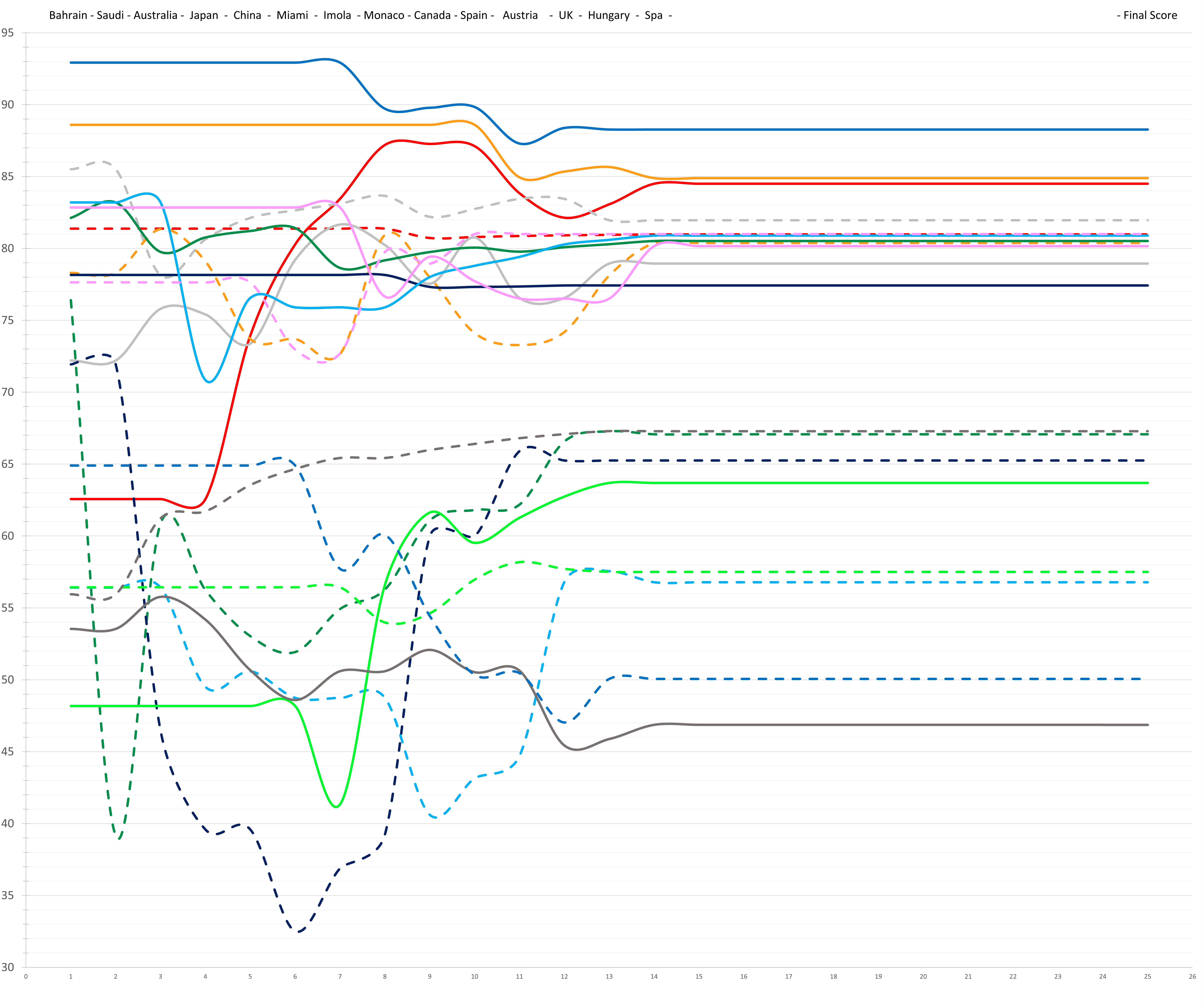 In no news to anyone, Aston Martin, Alpine and Sauber have suffered an incredible loss of performance compared to everyone else. This leaves Haas at the spear end of the midfield so far. Maybe a bit more surprising is that Williams is rated just as low as Sauber. However, according to the model they have the by far best driver in Albon out of the 2 teams. Additionally, Sauber has been consistent, while Williams have their highs and lows which is far more viable with the F1 points system.