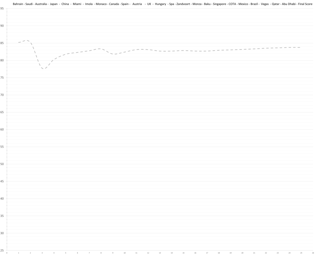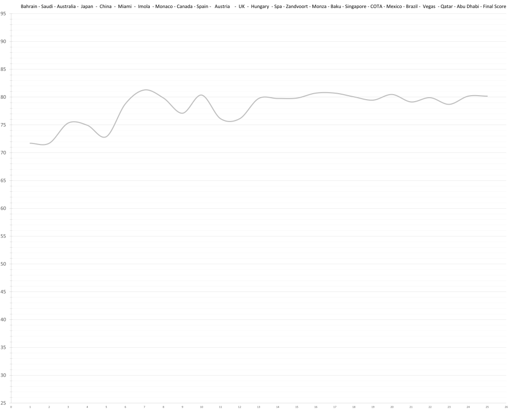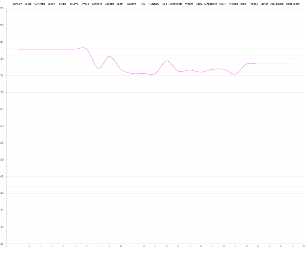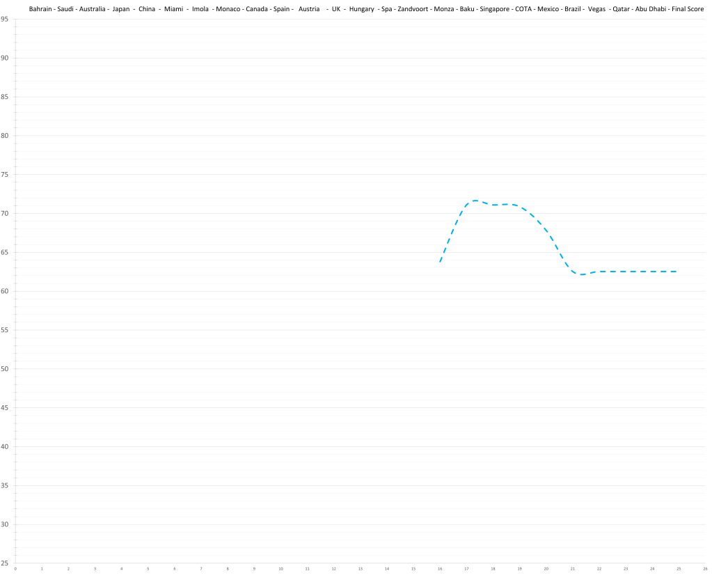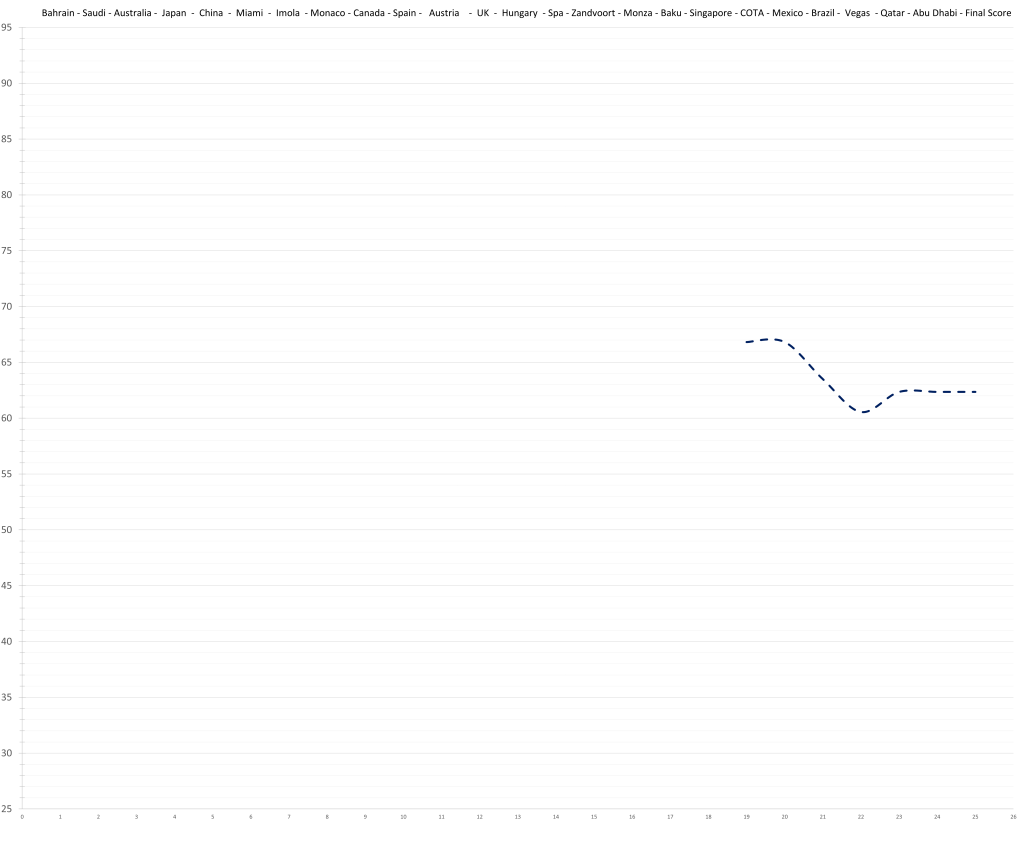 Based on his limited time in Formula 1, the model would predict that Logan Sargeant might have had a ceiling in the high 70s; although a relative lack of development is possible. This would actually be quite decent, but the reality is that no team wants to put resources and time into “quite decent”, especially not in the current hyper-competitive era. Especially, especially not, if he keeps maxing out the budget.