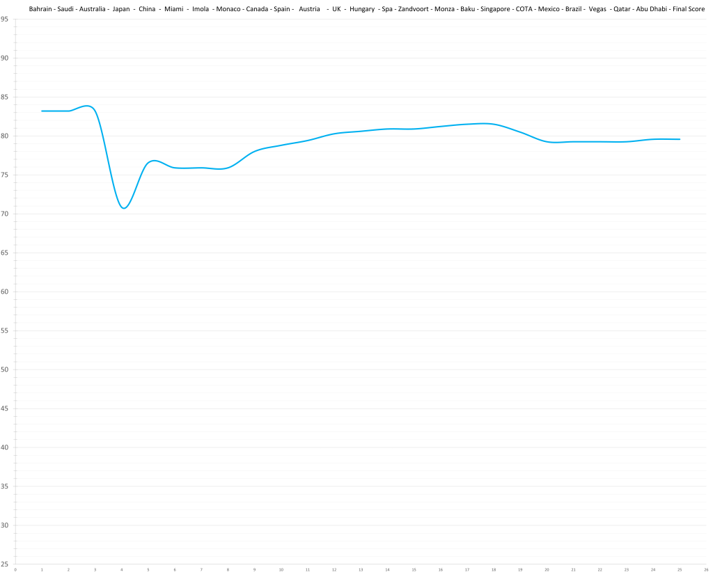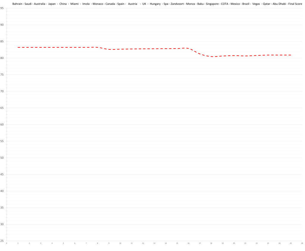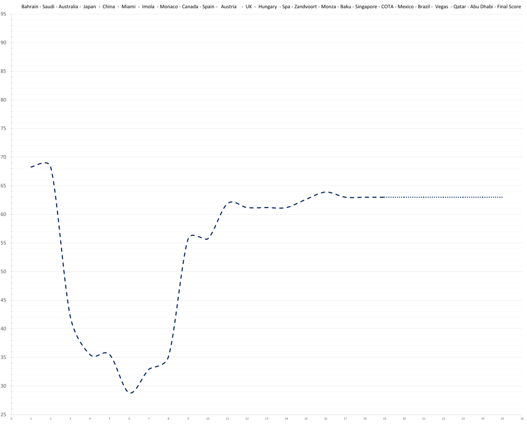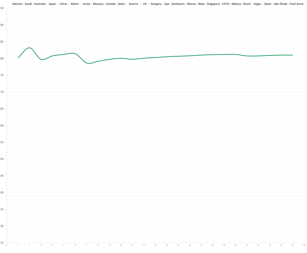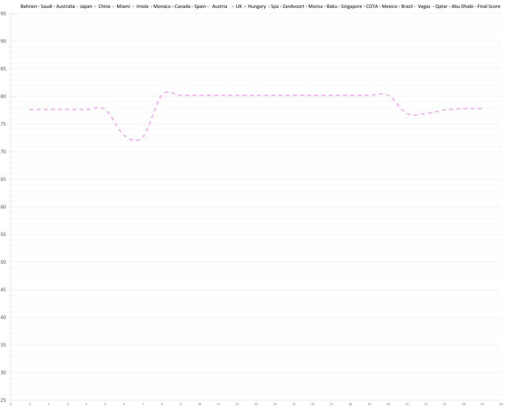Based on his limited time in Formula 1, the model would predict that Logan Sargeant might have had a ceiling in the high 70s; although a relative lack of development is possible. This would actually be quite decent, but the reality is that no team wants to put resources and time into “quite decent”, especially not in the current hyper-competitive era. Especially, especially not, if he keeps maxing out the budget.