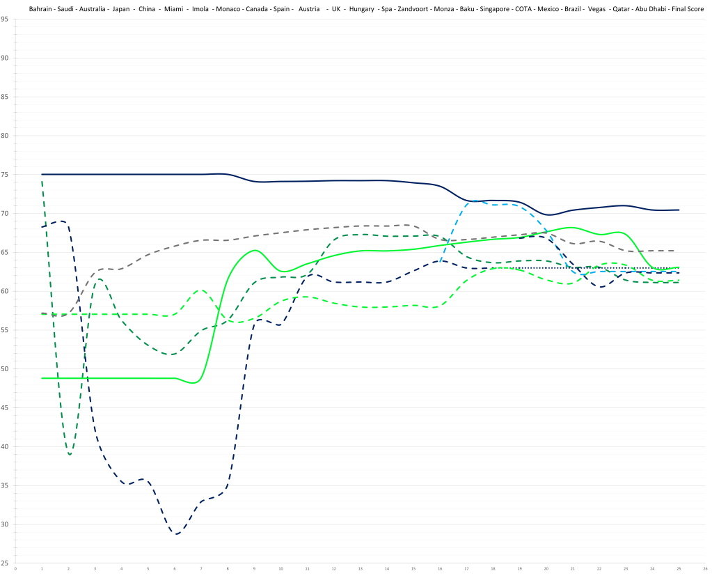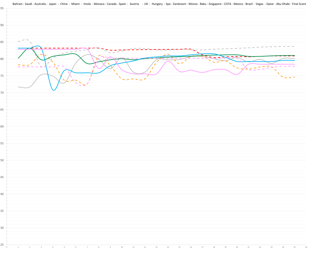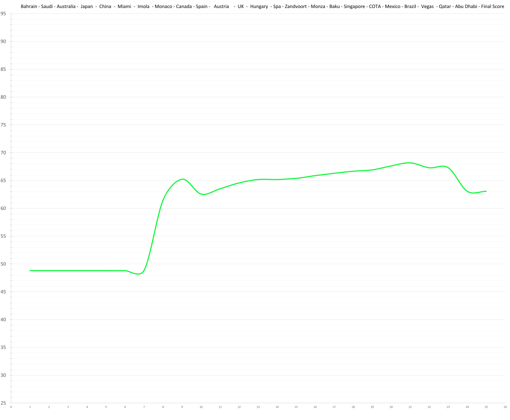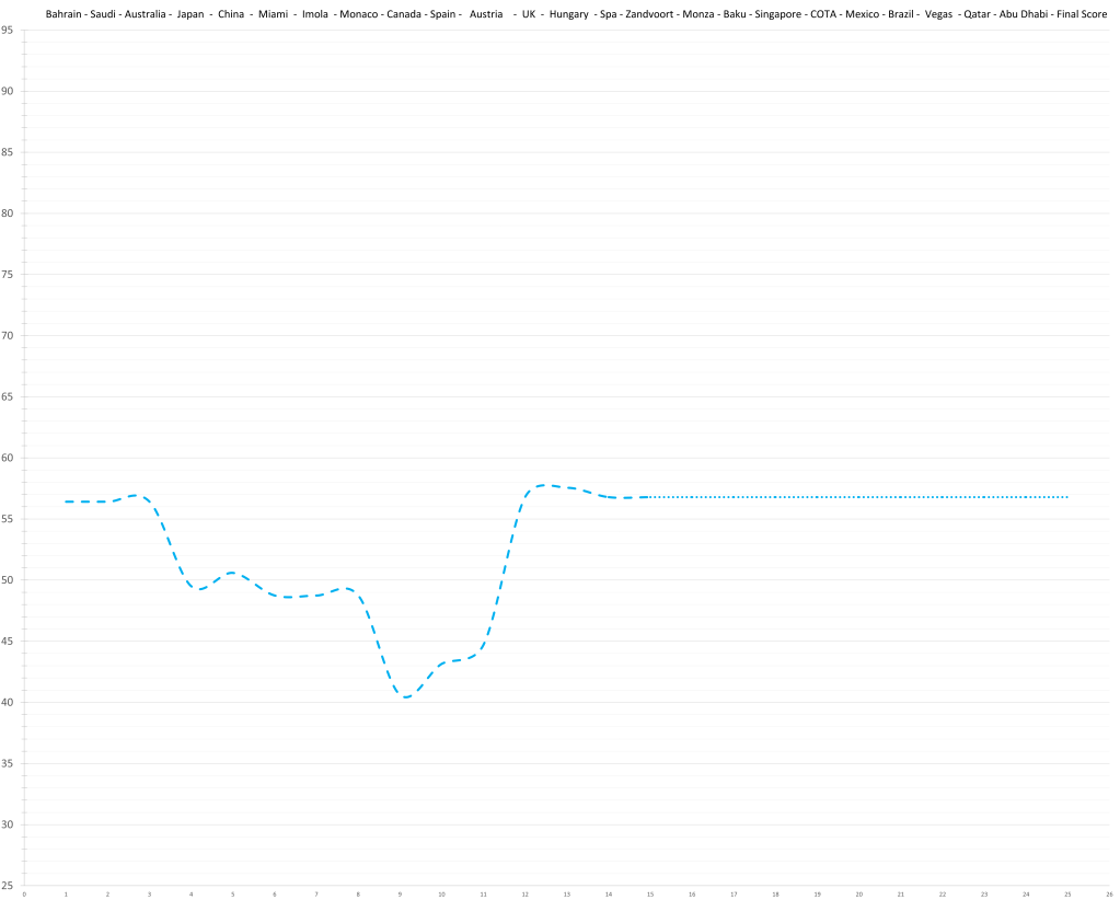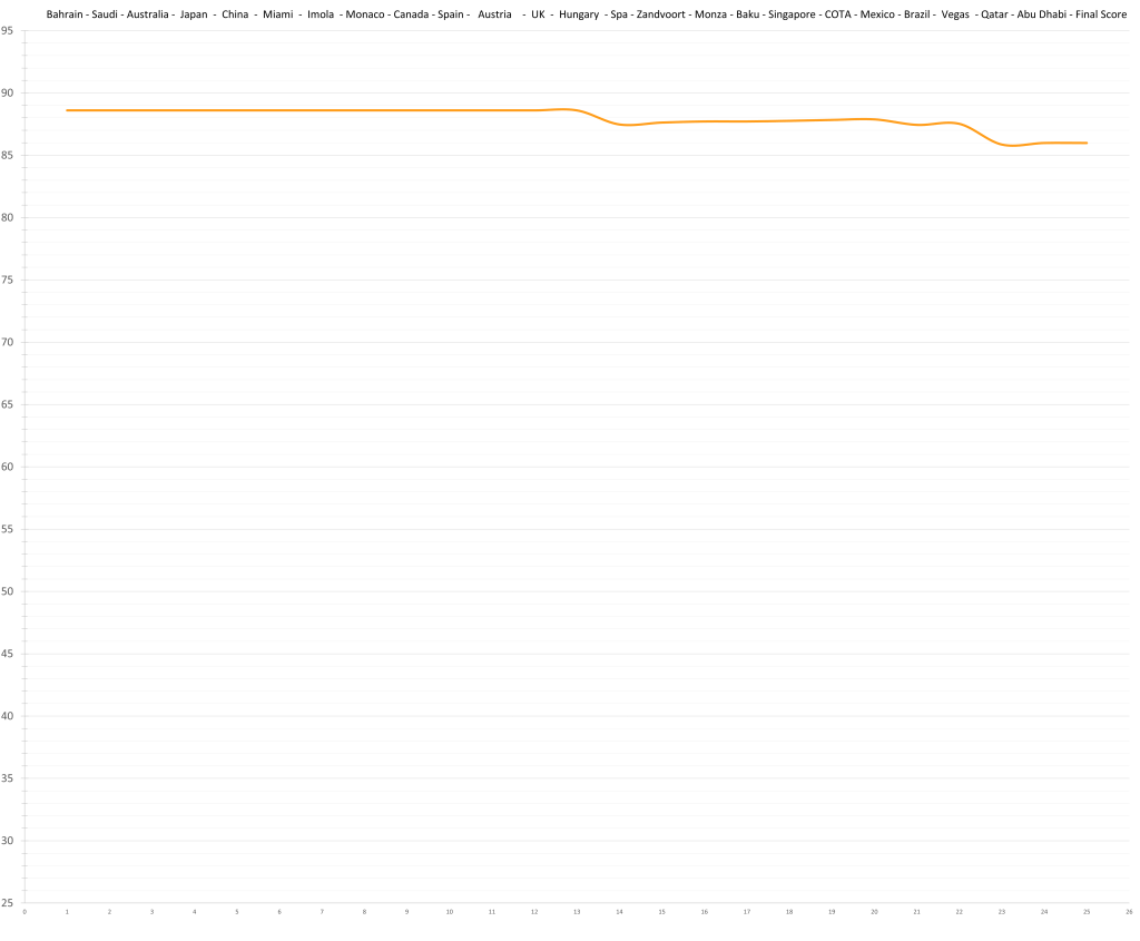 Based on his limited time in Formula 1, the model would predict that Logan Sargeant might have had a ceiling in the high 70s; although a relative lack of development is possible. This would actually be quite decent, but the reality is that no team wants to put resources and time into “quite decent”, especially not in the current hyper-competitive era. Especially, especially not, if he keeps maxing out the budget.