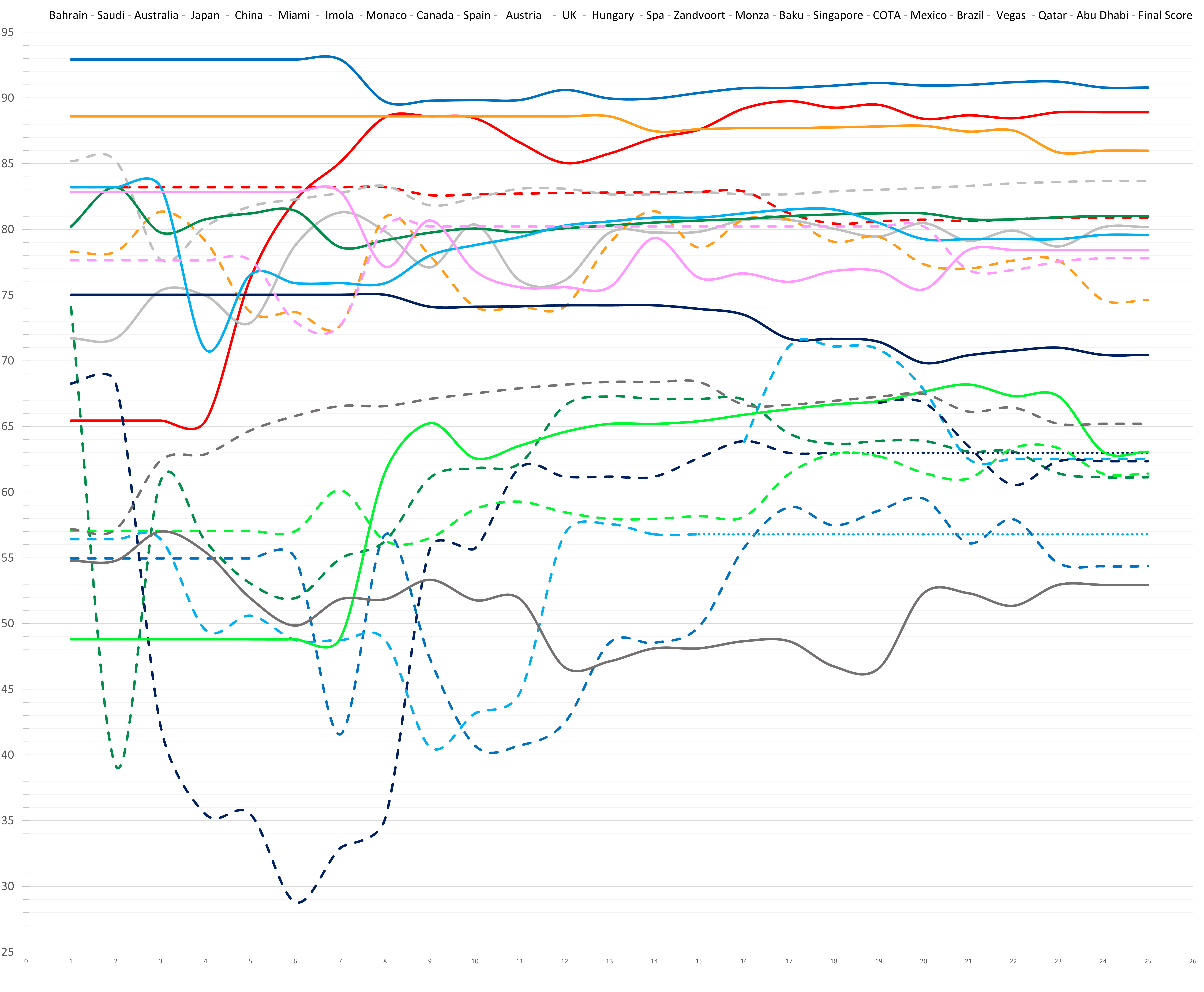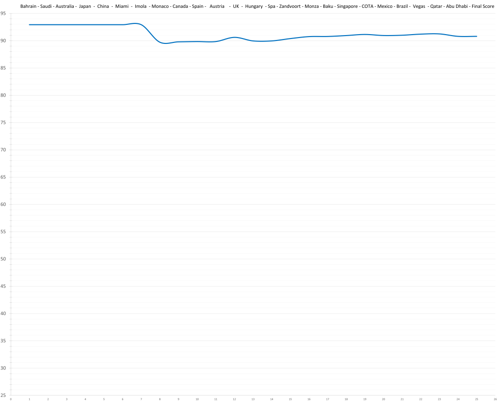 B) Maybe the drivers are correctly rated (relative to each other). What became increasingly clear is that the McLaren was only far ahead on low fuel resulting in great qualifying and late race performances, and unfortunately what stuck with people is the impression that Lando couldn’t hold on to his poles and came second with a clearly faster car. Over the whole race distance, McLaren wasn’t exactly dominant. The best example is Austria. Verstappen controlled the race until a poor pitstop put him in Norris’ range late in the race. Only at this point was the McLaren actually faster and Norris could get to Verstappen and try to overtake him. This was basically the pattern from Miami to the summer break.