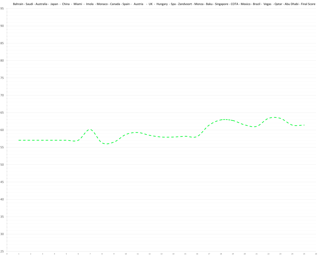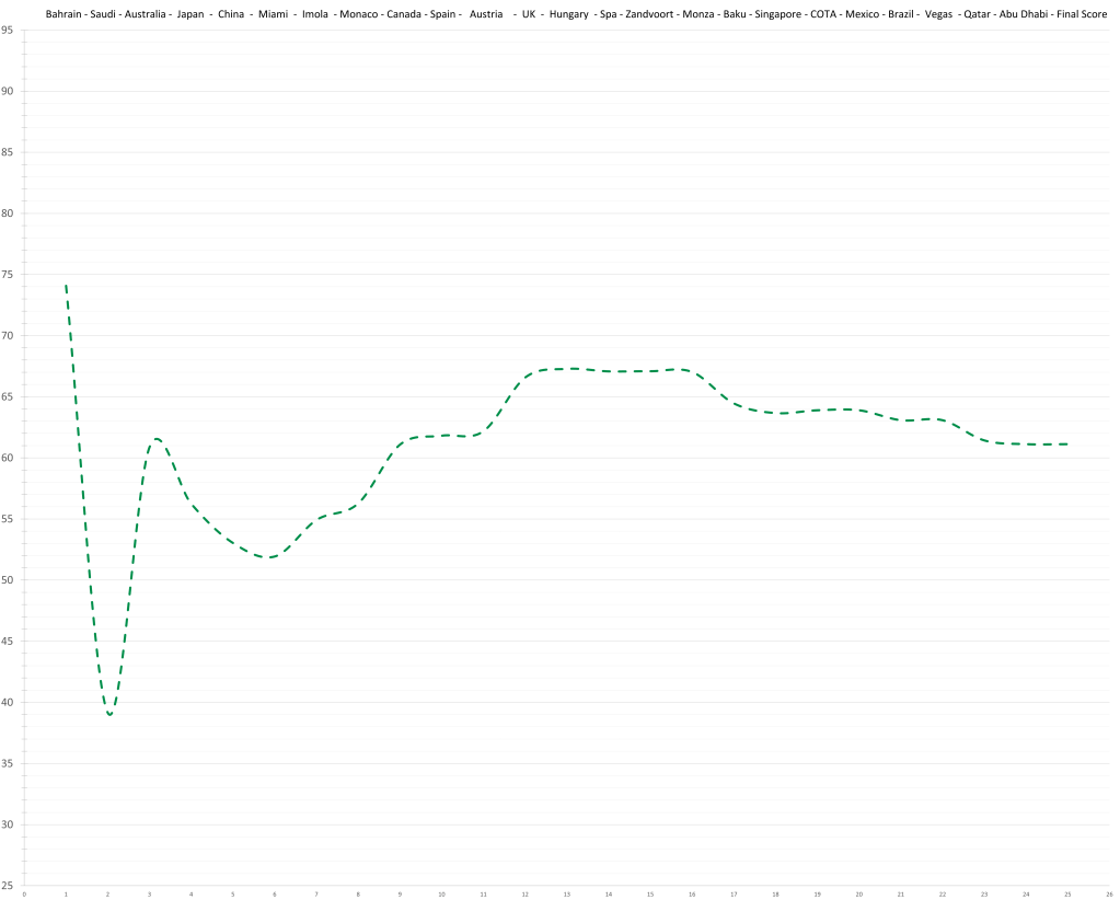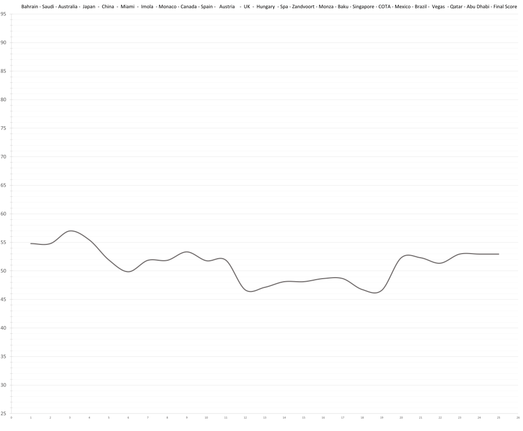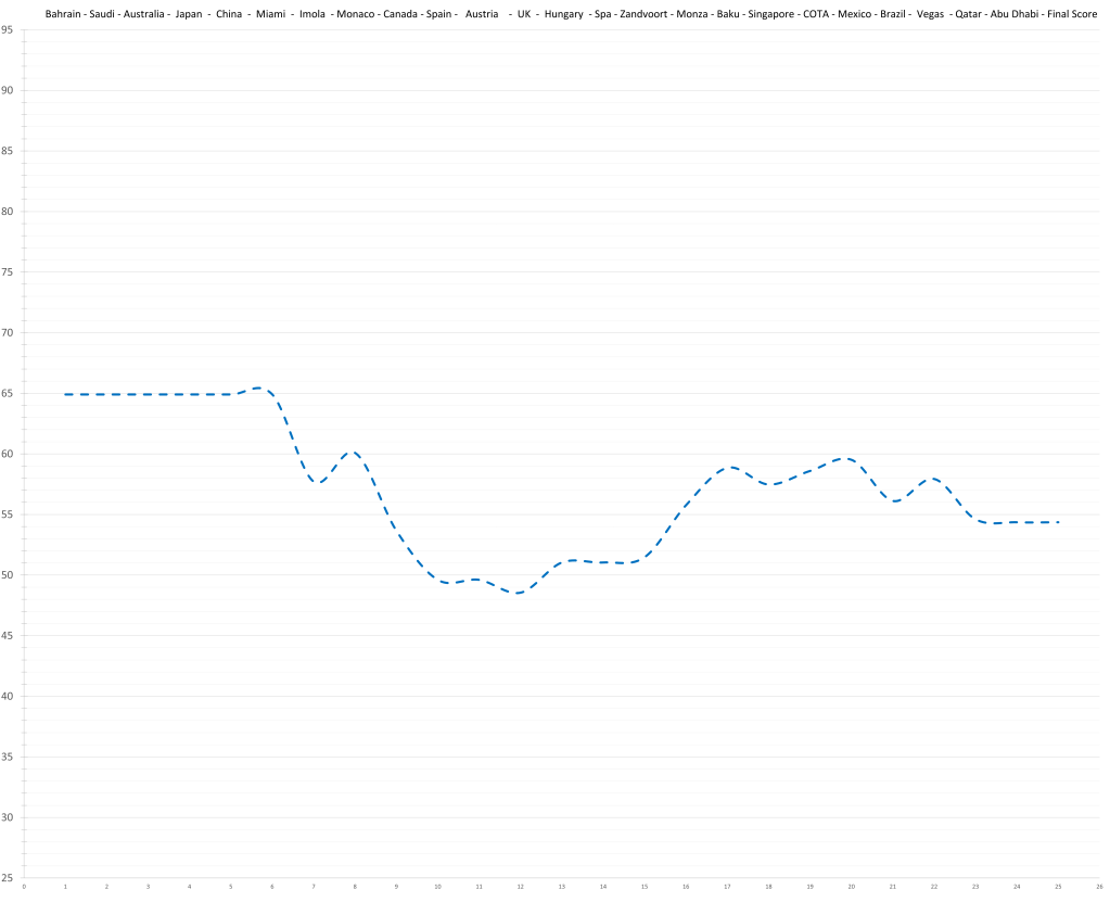 Zhou Guanyu had an insane quali deficit to Bottas this year, but that doesn’t quite show up in the race results (10-7 in counting races). Partly, because Bottas leans towards qualifying, and partly because the Sauber was so abysmal, it didn’t really matter, so why try. The gap in the ratings between him and his teammate has been surprisingly stable throughout the season. Still, he did not meet the low expectations set by his previous seasons in terms of pace; although, to be fair, he did show up towards the end of the season when the Sauber stopped going backwards.