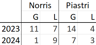 Two things are immediatley obvious: While a small part of the difference likely comes from Norris starting ahead of Piastri most of the time, Piastri is a better starter than Norris is. They also gained far fewer positions in 2024 than in 2023 which can be attributed to simply starting higher up the grid. Looking at the loss numbers, they are roughly the same in both years. This suggests that Norris did not actually crumble. He can still work on this to become better, but the notion that he choked under pressure seems somewhat absurd. In previous seasons, Lando’s start stats were 7/13 (2022), 3/11 (2021), 9/9 (2020, shortened season), and 13/12 (2019). In spite of a slight upward trajectory, it seems like Norris has been an inherently poor starter from the beginning. This means it is part of his current potential, hopefully alleviating fears of him being overrated in 2024.
