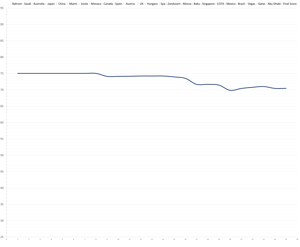 Each driver has their own entry including a graph documenting the change of their season rating through the races, a short summary and of course the actual rating. Behind the rating (in parentheses) you’ll find the drivers expected baseline rating for the 2024 season. It roughly equates to pace and can be understood as a ceiling (only for this season since this value moves with age and experience). It gives you a better understanding and context for the actual driver rating in terms of underperformance, mistakes, consistency, speed etc.